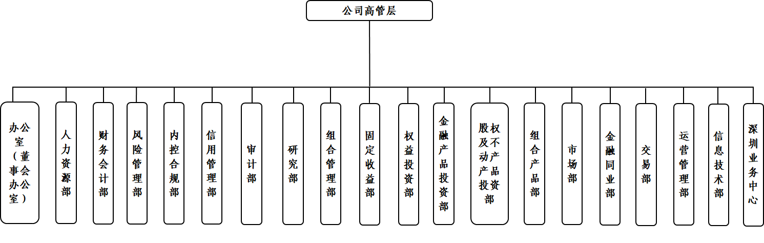 职责分工:分管办公室(董事会办公室)、财务会计部、纪检办公室、组合管理部、组合产品部、信息技术部、交易部。